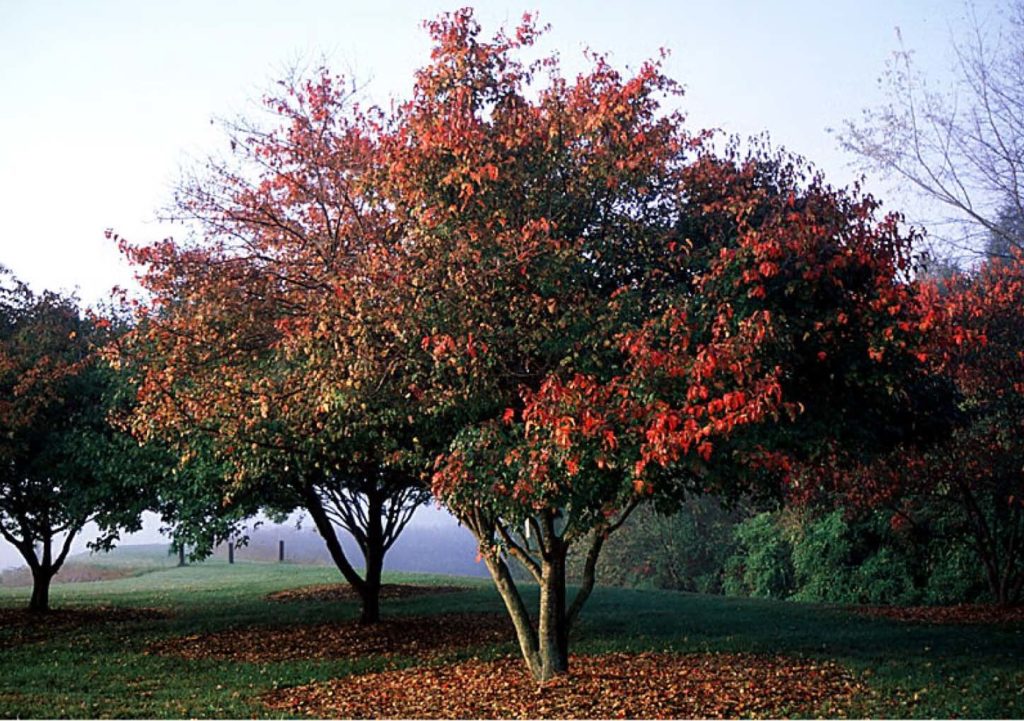 - Листва: Листья зелёные летом, осенью приобретают яркие оттенки красного и оранжевого